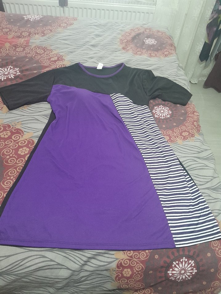 Salaş kesim mayo tunik, tekne yakalı ve kısa kolludur. Mor, siyah ve çizgili detaylarla, sentetik kumaştan günlük kullanım için uygundur. birkez giyilmistir