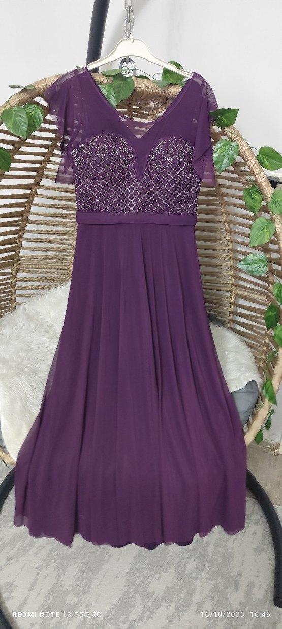 Mor Uzun İşlemeli V Yaka Abiye Elbise bir defa giyildi