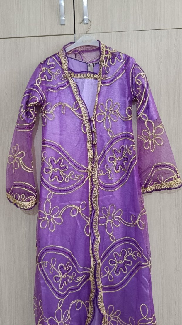 Mor uzun elbise, tek renk, kısa kollu ve salaş kesimdir. Yaka kısmında drapeli detay bulunur, düğün gibi özel günlere uygundur.