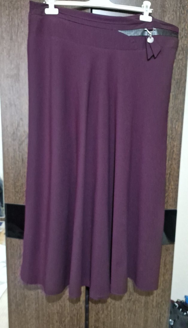 Bu koyu mor uzun etek, bol kesim ve dökümlü tasarıma sahip, yumuşak sentetik kumaştan üretilmiştir, minimalist ofis stiline uygundur. bel eni 53 cm uzunluk 100