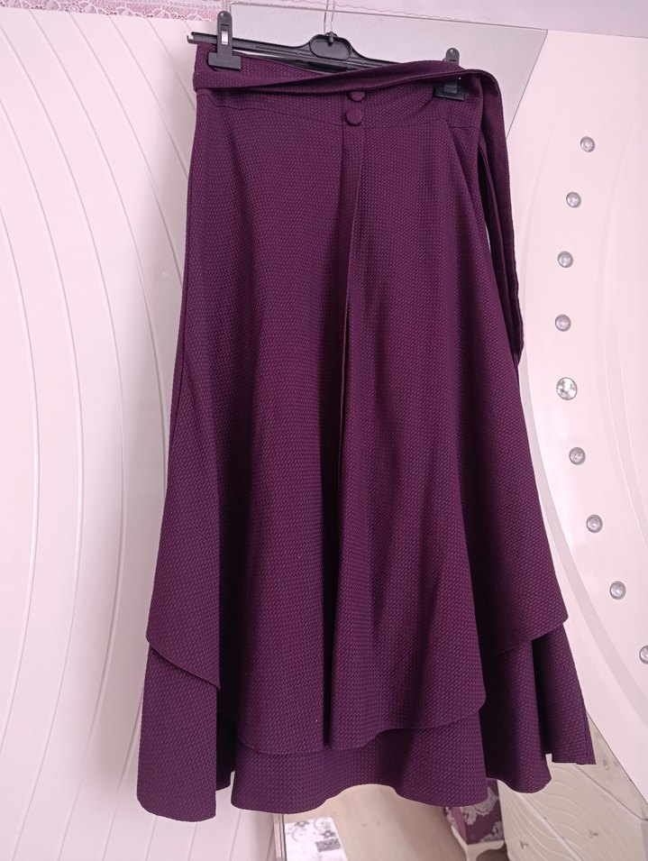 Mor renkli, uzun, beli düğmeli, sentetik kumaştan yapılmış, bol kesim ve drapeli kadın eteği. Günlük kullanım için uygundur.