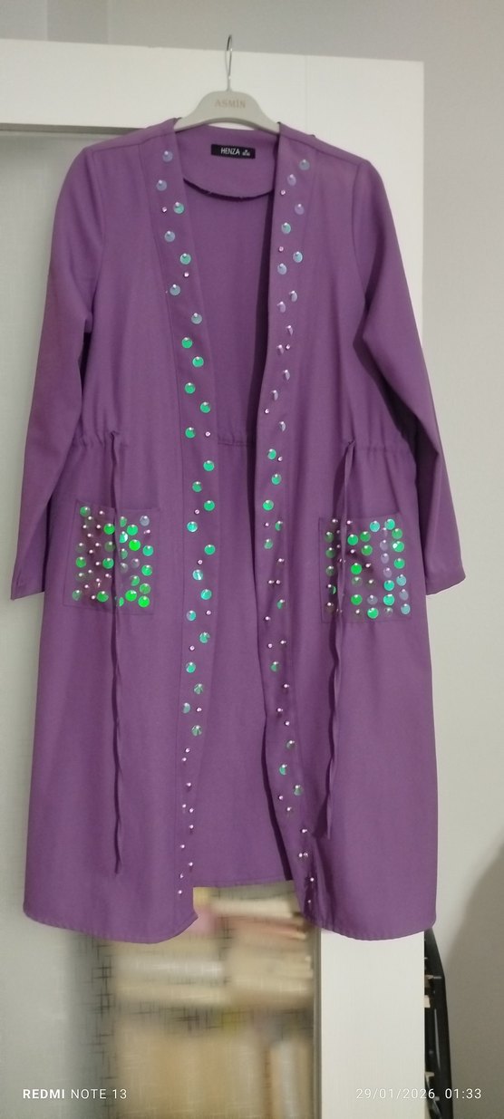 Mor, uzun, bol kesim kadın kaban, boncuk detaylıdır. Notlu yakası ve uzun kolları vardır. Sentetik kumaş ve nakışlı deseniyle parlak, bohem tarzda.