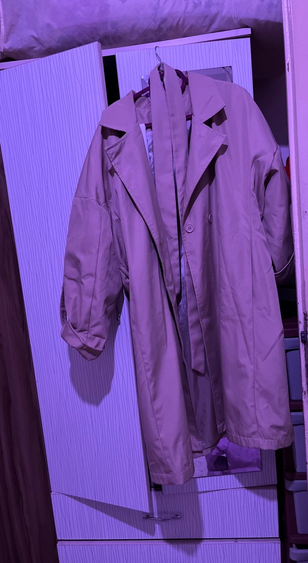 Mor renkli, uzun kesim, düğmeli kadın trençkot. Suni kumaştan üretilmiş, geniş kesim ve uzun kolludur. Sokak stili için uygundur.