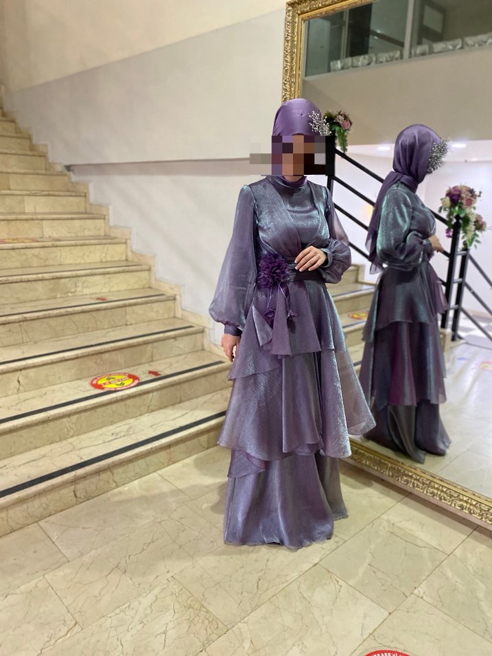 Mor Uzun Kat Kat Abiye Elbise Şal dahil