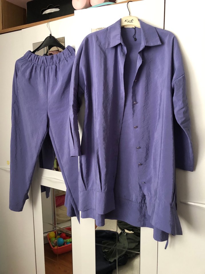 Mor uzun kesim, keten kumaştan salaş takım Düğmeli ceket, kesik yakalı ve uzun kolludur, hafif parlak kumaş