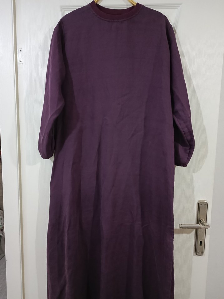 Mor renkte, keten kumaştan yapılmış, bol kesim uzun kollu elbise. Yuvarlak yaka ve drapeli tasarımıyla sade ve mütevazı bir stil sunar.