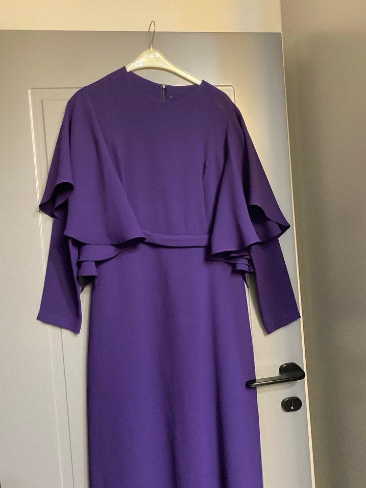 Mor uzun kol ve yuvarlak yakalı, drapeli tasarıma sahip kadın elbisesi. Modern klasik tarzda, ofis için uygun, rahat kesim ve sentetik kumaştan üretilmiştir.