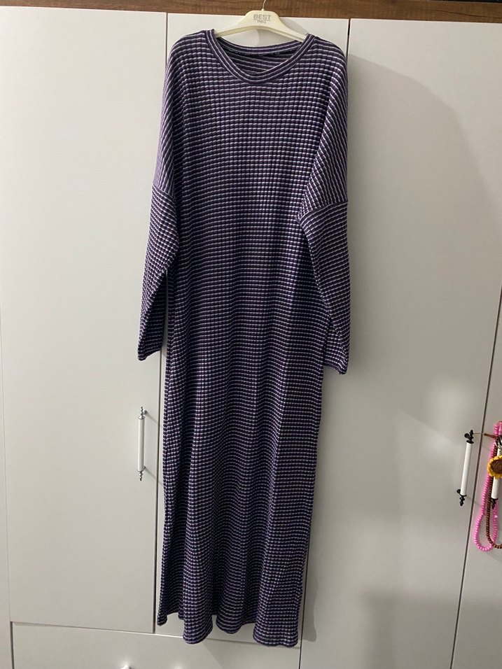 Uzun kolu ve bol kesimiyle mor renkte, yumuşak sentetik kumaştan yapılmış, hafif batik desenli ve pileli dokulu, modest tekne yaka günlük rahat elbise.