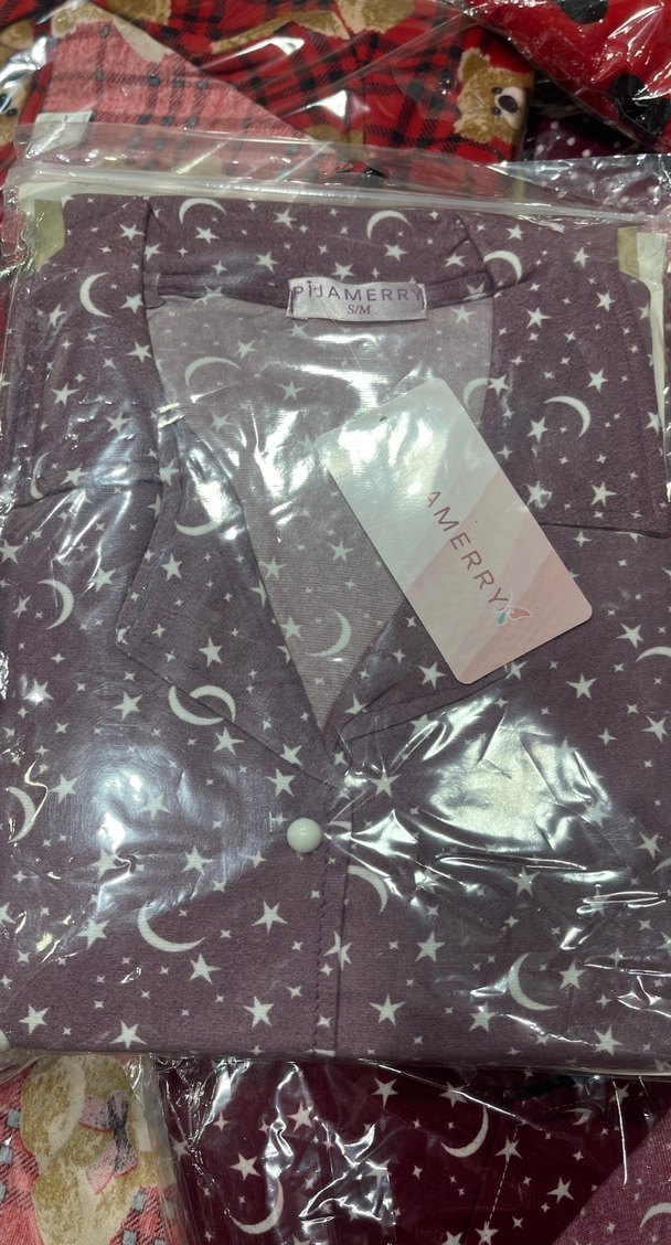 Mor renkli, uzun kollu ve normal boyda, ay ve yıldız desenli kadın pijama takımı. Rahat ve fitted kesim sunar.
