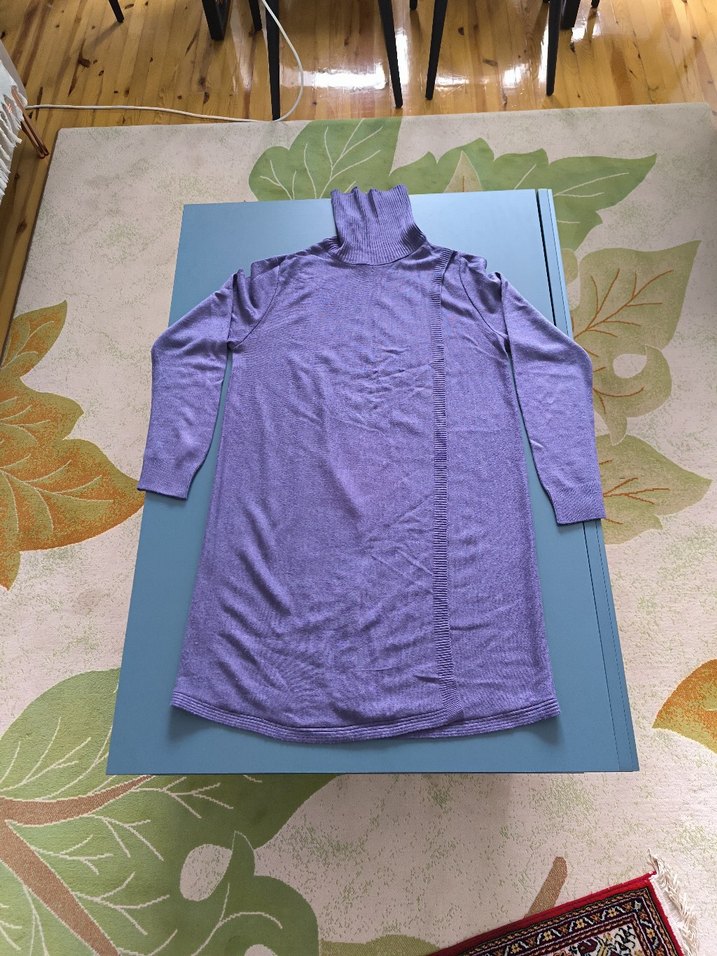 Mor renkte, boğazlı ve uzun kollu kadın kazak. Yumuşak ve sıcak kumaştan, rahat dökümlü ve normal midi boyda. Günlük kullanıma uygun.