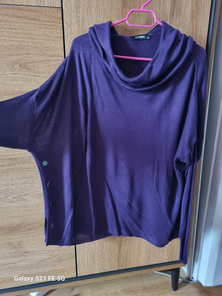 Mor renkte, uzun kollu, boğazlı ve salaş kesime sahip kadın kazak. Normal midi boyda, yumuşak sentetik kumaştan, günlük rahat sokak stili için uygun.