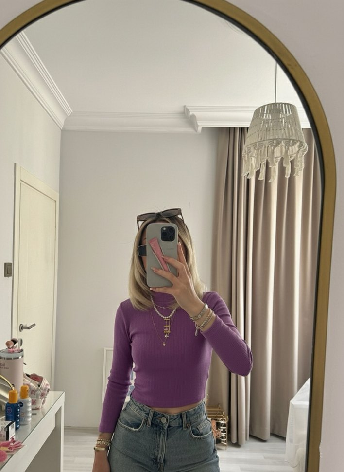 Mor uzun kollu crop bluz, vücuda oturan kesimi ve yumuşak dokusuyla rahat kullanım sağlar.