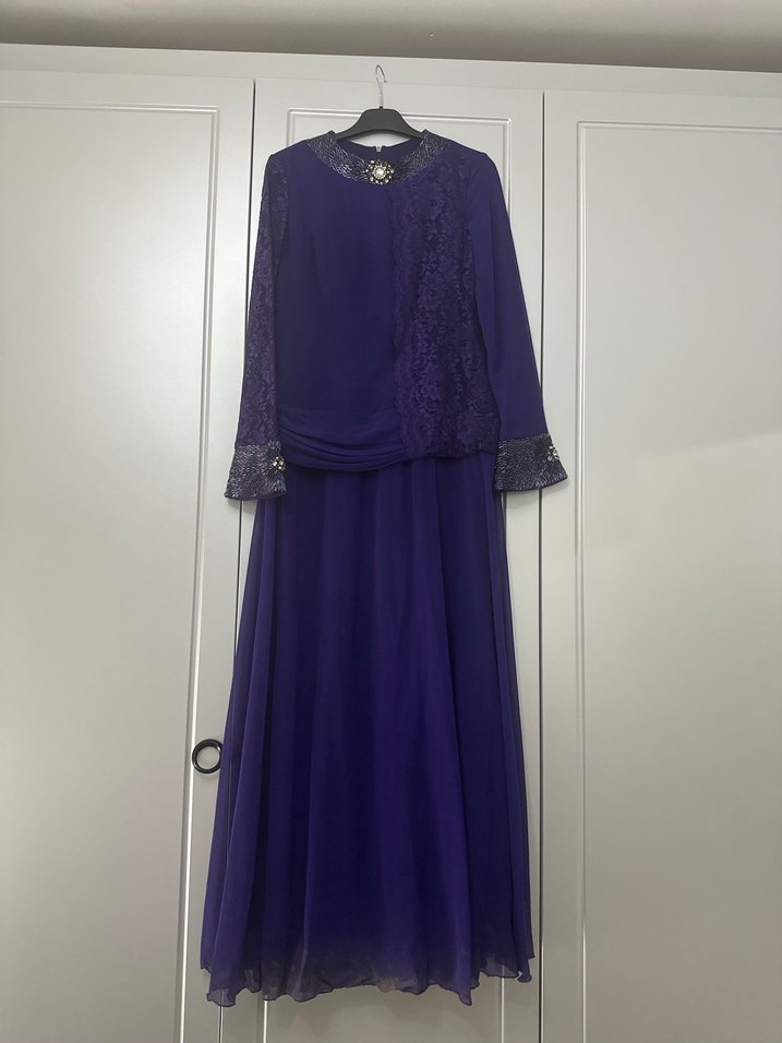 Mor renkte, uzun kollu ve yuvarlak yakalı, bol kesim uzun abiye elbise. Drape ve dantel detayları ile şık bir görünüme sahiptir.