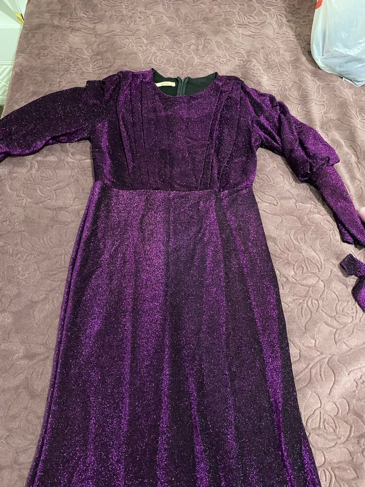 Bu mor uzun abiye elbise, drapeli tasarımı, uzun kolları ve tekne yakası ile dikkat çekiyor. Koyu mor rengi ve desensiz kumaşıyla partiler için şık ve gotik bir görünüm sunar. ✨ 42 bedendir