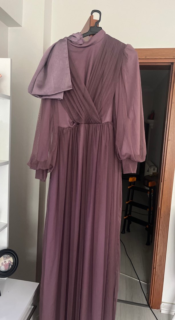 Mor uzun kollu, yüksek yakalı ve bol kesim drapeli abiye elbise. Modern klasik tarzda, vintage dokunuşlu, düğünler için uygun.