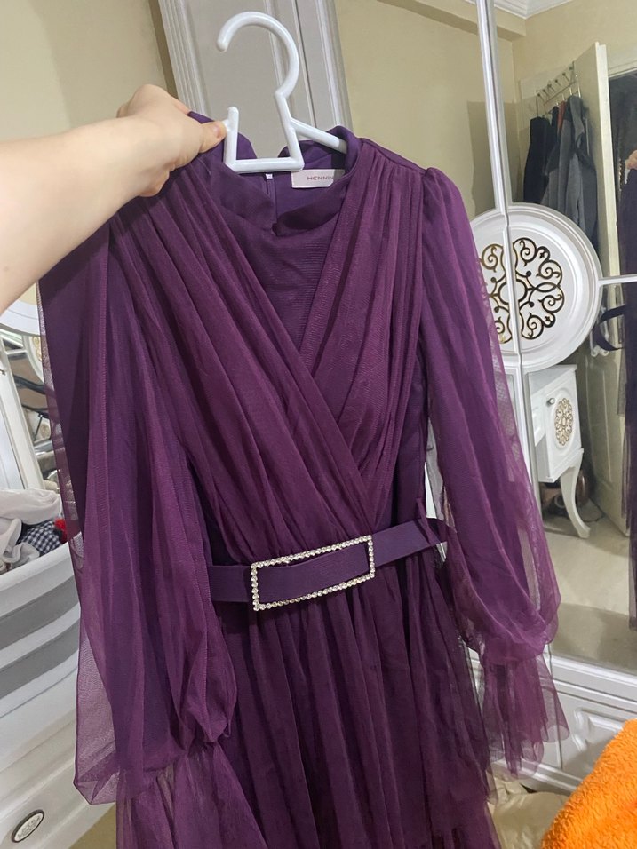 Mor uzun kollu, drapeli ve v yaka abiye elbise. Şeffaf uzun kollu, ince kesim ve parlak kemer detayıyla klasik zarafet ve bohem stilini yansıtıyor. 1 kere kullanıldı söz kesiminde. 36 beden ama 38 rahatlıkla kullanabilir ben 38’im.