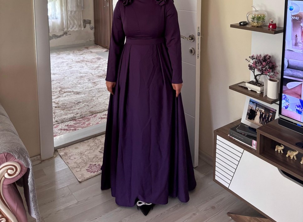 Mor uzun kollu, yüksek yakalı drapeli abiye elbise. Düzenli kesim, desen yok, mütevazı ve geleneksel gotik tarzda, düğün için uygun.