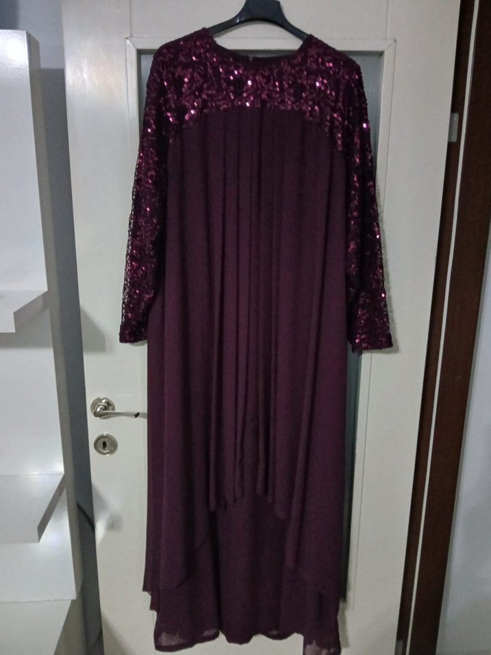 mor renkli, uzun kollu, drapeli ve payet detaylı üst kısmı olan bol kesim abiye elbise, şık ve gösterişli bir görünüm sunar.