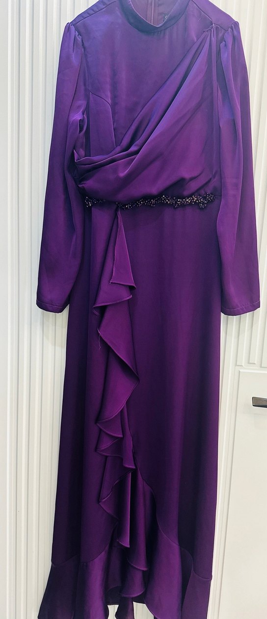 Mor uzun kollu abiye elbise, drapeli ve nakışlı detaylara sahiptir. Yuvarlak yaka ve regular fit ile düğünler için uygundur. Bir iki yerinde hafif tel çekmeler var