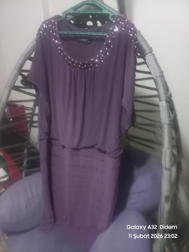 Mor Uzun Kollu Drapeli Abiye Elbise her bedene uygundur