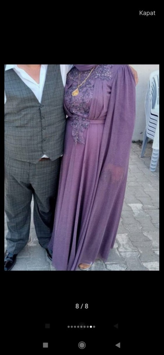 Mor renkte, uzun kollu ve drapeli tasarıma sahip bu abiye elbise, notched lapel yakası ve klasik şıklığıyla düğünler için uygundur. 1 defa giyildi