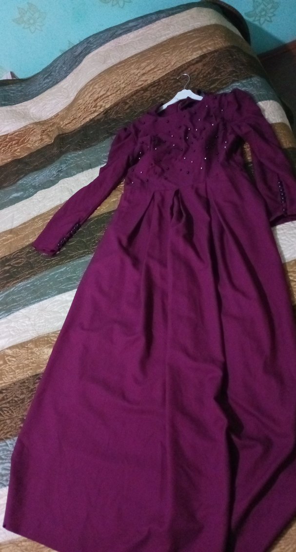 Mor renk, uzun kollu ve drapeli kadın abiye elbise. Oturan kesimi ve yakası notched lapel modelindedir. Düğün için uygun, mütevazı ve bohem tarzda.