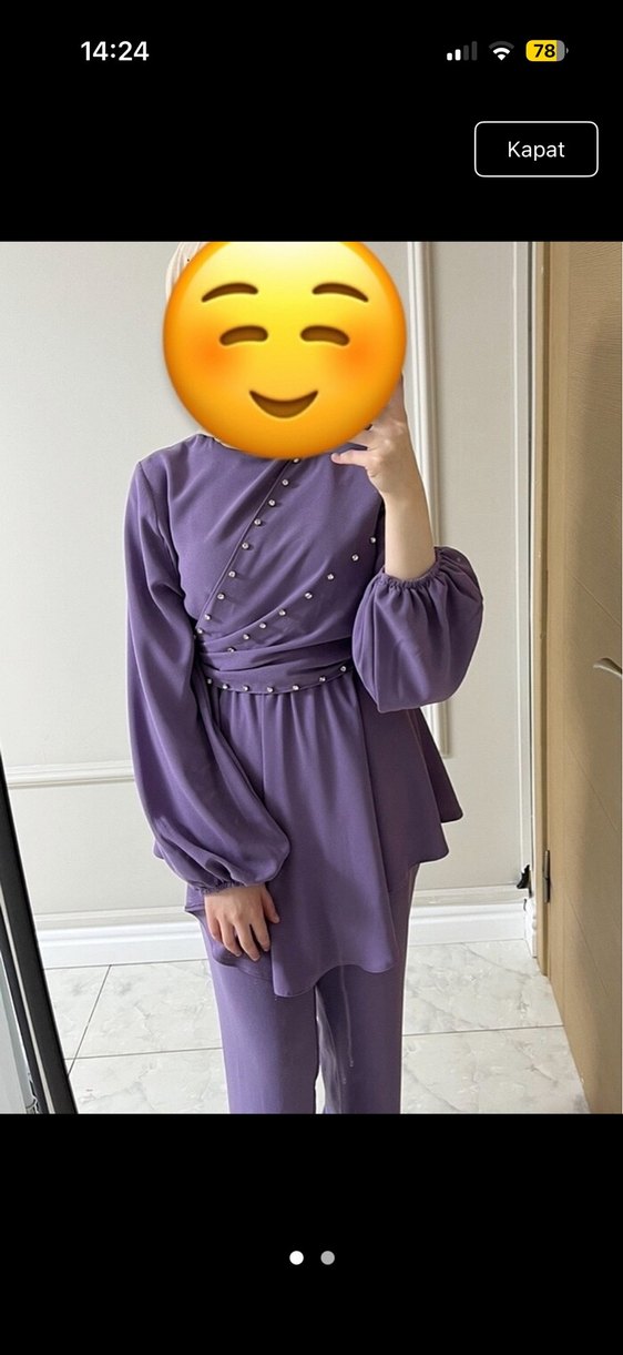 Mor renkli, yüksek yakalı, uzun kollu ve drapeli tasarıma sahip kadın takımı. Parlak ve ipeksi kumaftan yapılmış, günlük kullanıma uygun sade ve mütevazı stil.