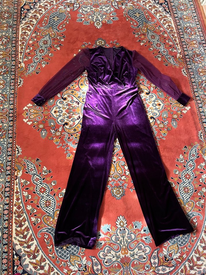 Koyu mor renkte, uzun kollu ve V yakalı, drapeli tasarıma sahip sentetik kumaştan yapılmış fitted uzun tulum. Parti için uygun, bohem ve retro tarzda.