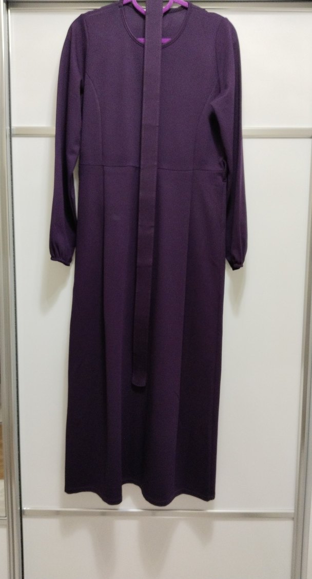 Mor renkte, yüksek yakalı ve uzun kollu, sentetik kumaştan yapılmış drapeli uzun elbise. Düzenli kesimiyle ofis için uygundur.