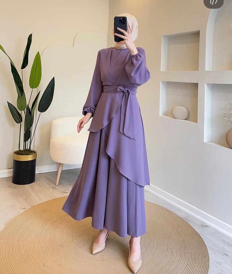 Mor uzun kollu, yüksek yakalı, ipeksi kumaştan drapeli ve kuşaklı uzun takım özel günler için uygun modest tarzda.