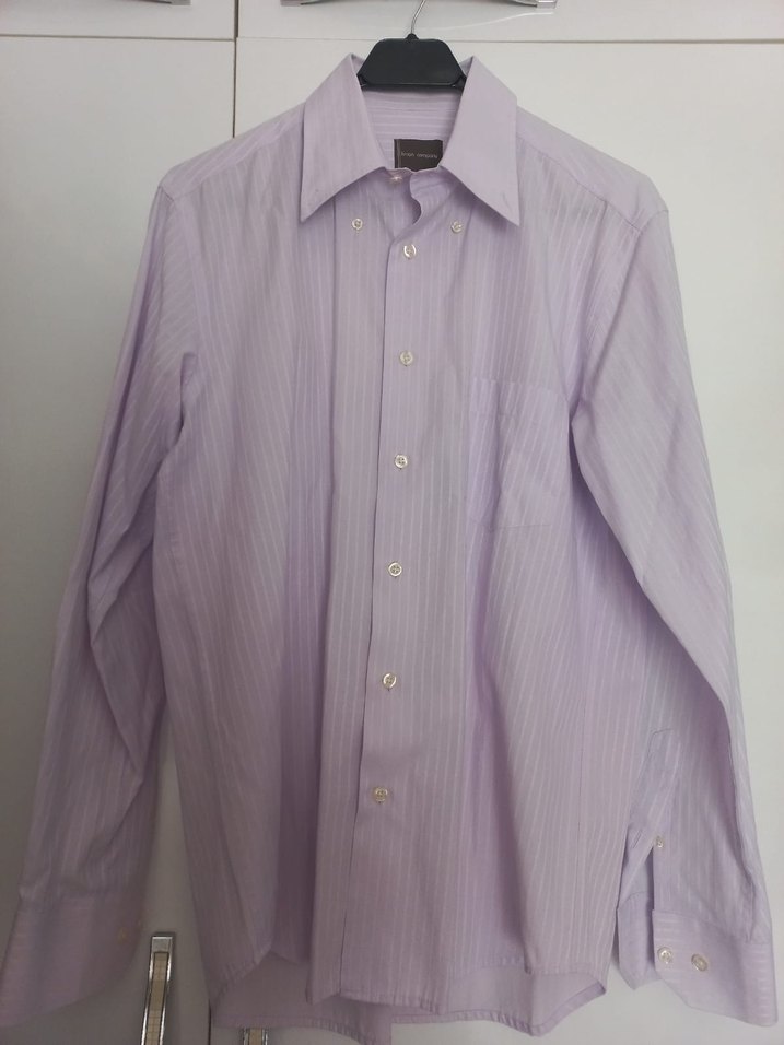 Mor pastel renkte, düğmeli, normal boyda, uzun kollu ve ipeksi kumaştan yapılmış erkek gömleği. Ofis ortamı için uygundur.