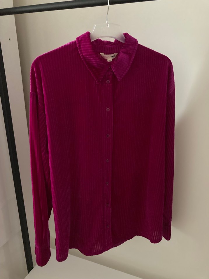 Mor renkli, uzun kollu, düğmeli ve yakalı gömlek. Rengi göründüğünden daha koyu bir mor kadife saten gibi parlaktır.