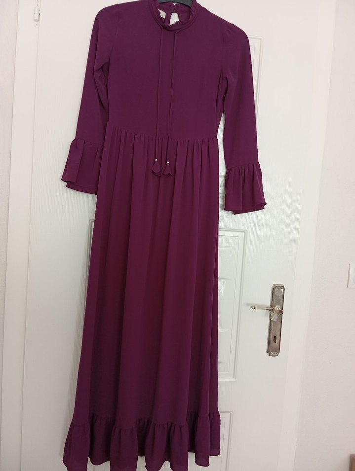 Mor renkli, uzun kollu, yüksek yakalı bu uzun elbise; bilek ve etek uçlarında fırfırlar bulunur. Bol kesim ve sade, mütevazı bohem tarzda,