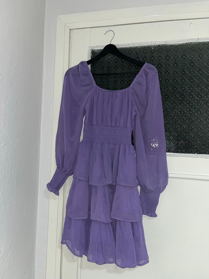 Mor renkli, uzun kollu, bol kesim elbise; fırfırlı katmanlar, lastikli bel ve nakış detaylarıyla romantik akşamlar için uygundur.