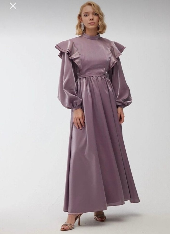 Mor uzun elbise, yüksek yakalı ve fırfırlı omuz detaylıdır. Salaş uzun kollu, parlak kumaştan yapılmıştır ve düğünler için uygundur.