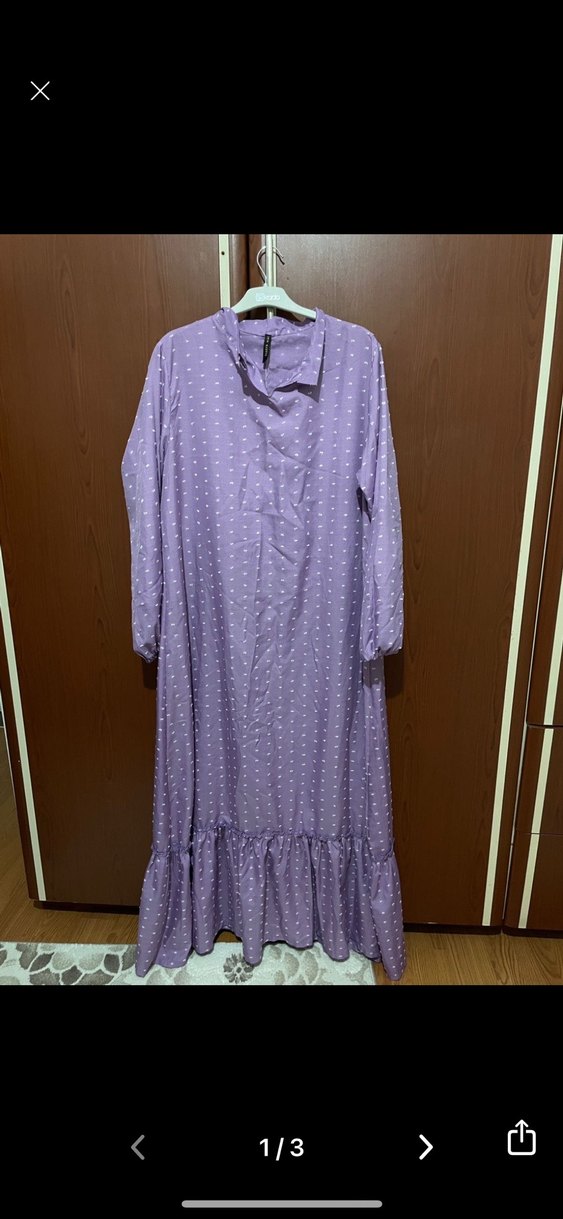 Pastel mor renkte,etek kısmında fırfır detaylı, bol kesim uzun elbise. Yumuşak sentetik kumaştan, uzun kollu ve hafif desenli, bohem tarzda.