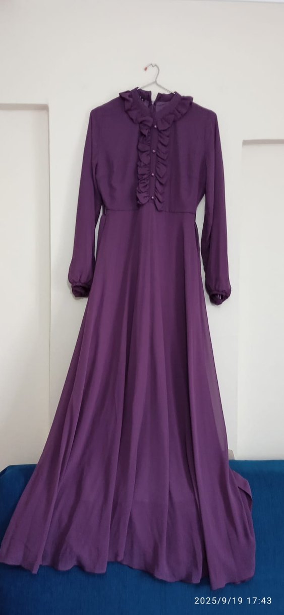 Mor Uzun Kollu Fırfırlı Uzun Elbise