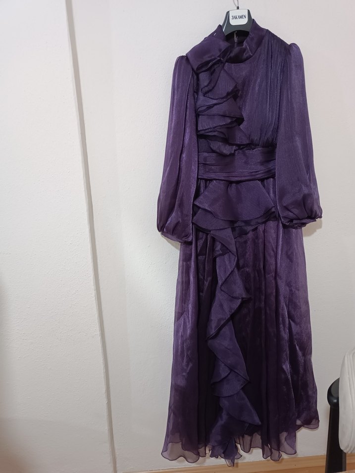 Koyu mor uzun kollu, yüksek yakalı ve bol kesim vintage elbise. Fırfır detaylarıyla düğün gibi özel anlara uygun.