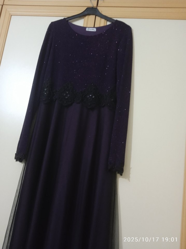 Koyu mor renkte, uzun kollu ve kayık yaka olan bu uzun abiye elbise, bol kesim ve drapeli detaylara sahiptir. Düğün ve gotik stil için uygundur. ✨
