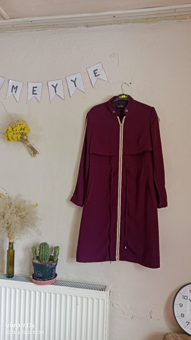 Bordo renkli, yüksek yaka ve fermuarlı, satenimsi kumaştan tasarlanmış, bol kesim uzun kollu hamile kabanı.