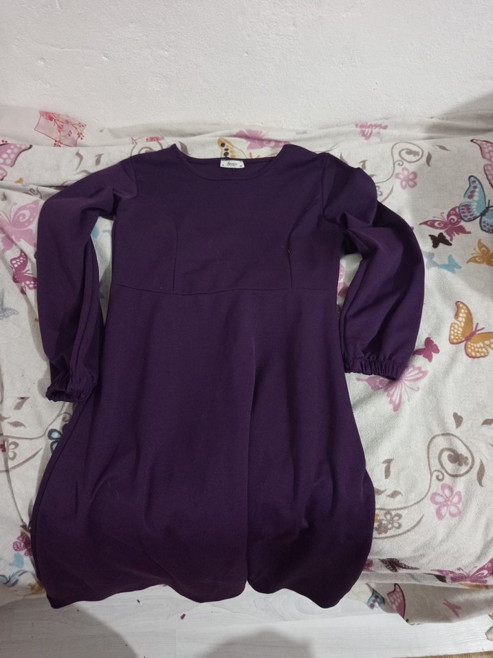 Bu koyu mor hamile tunik, uzun kollu ve yuvarlak yakalıdır. Bol kesimi, drapeli tasarımı ve midi boyuyla günlük kullanıma uygundur. Sentetik kumaştan üretilmiştir.