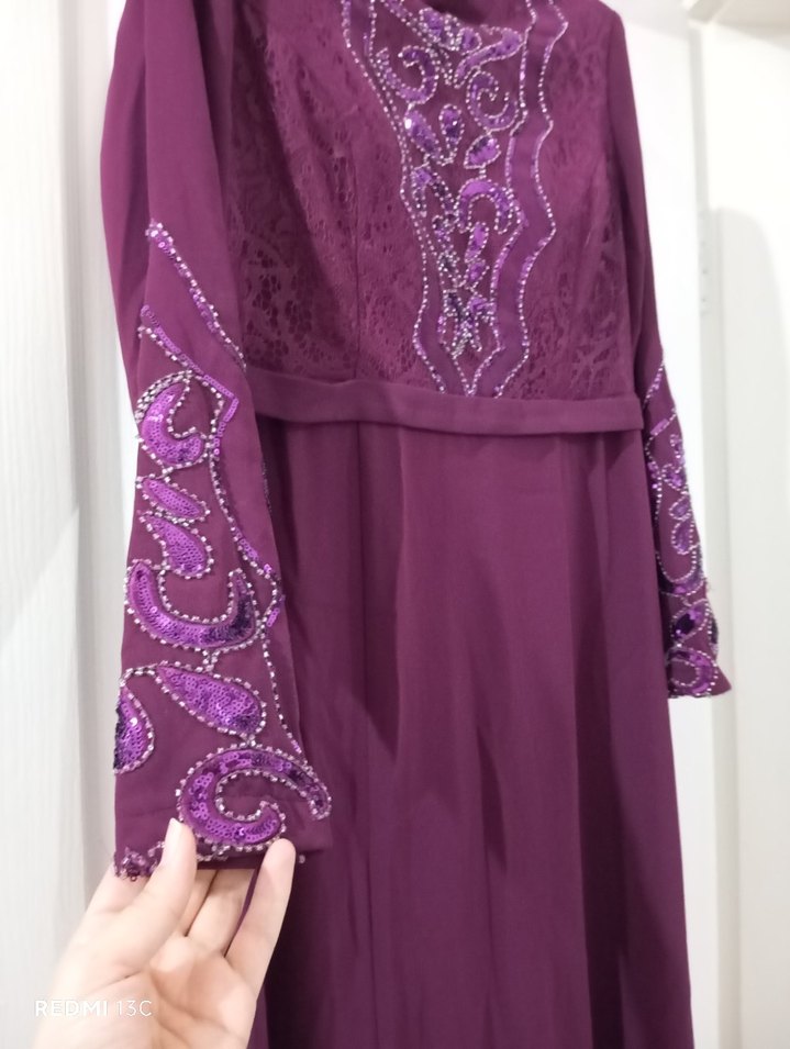 Mor renkte, uzun kollu ve V yakalı abiye elbise. İşlemeli ve boncuk detaylarıyla sade ama gösterişli bir tasarıma sahip, düğün için uygun.