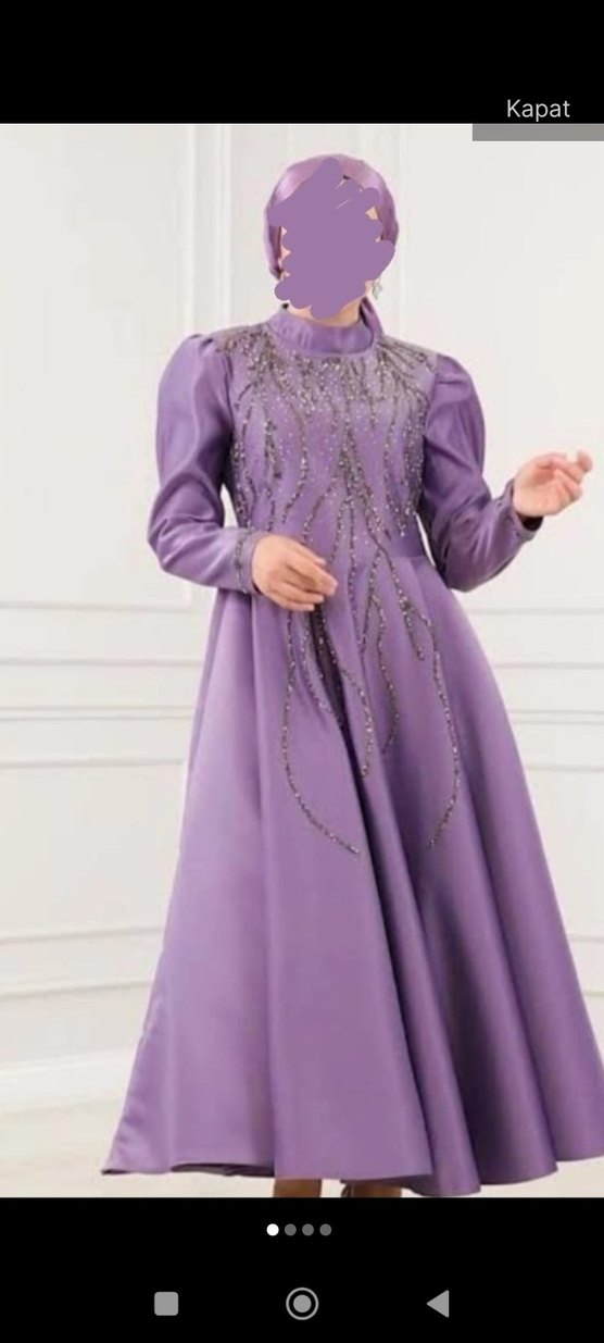 Mor renkli, uzun kollu ve yüksek yakalı bu abiye elbise işlemeli detaylara ve dökümlü, regular kesime sahiptir. Düğünler için uygundur, çağdaş ve parlak bir tasarıma sahiptir. şal dahil
