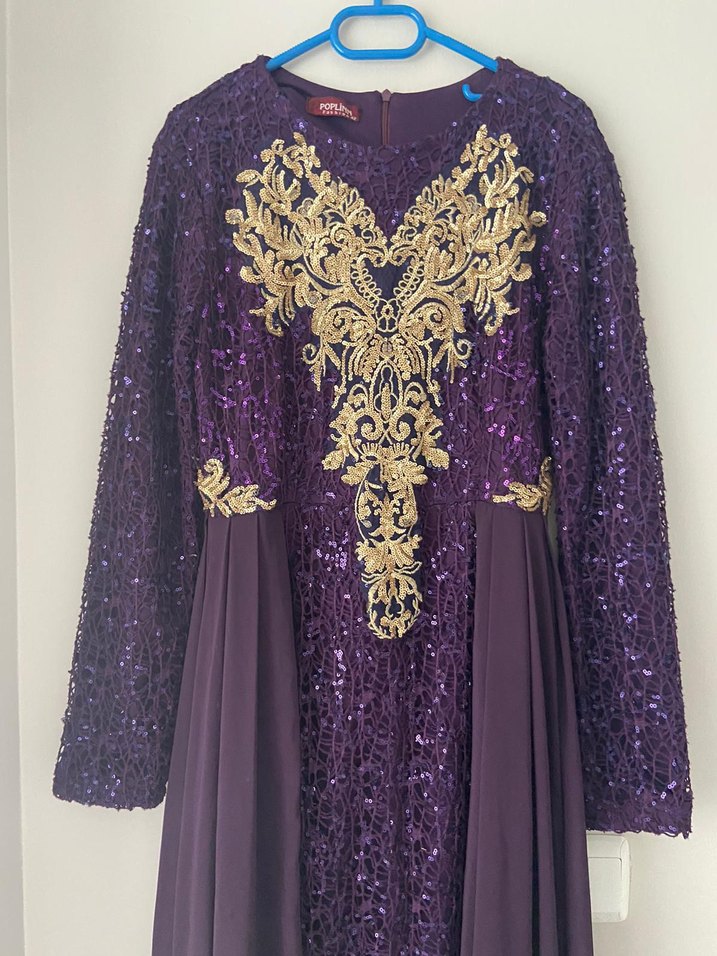 Mor uzun kollu abiye elbise, işlemeli ve desenli kumaşlarla drapeli, bol kesim ve V yaka detaylarına sahiptir. Düğünler için uygundur.
