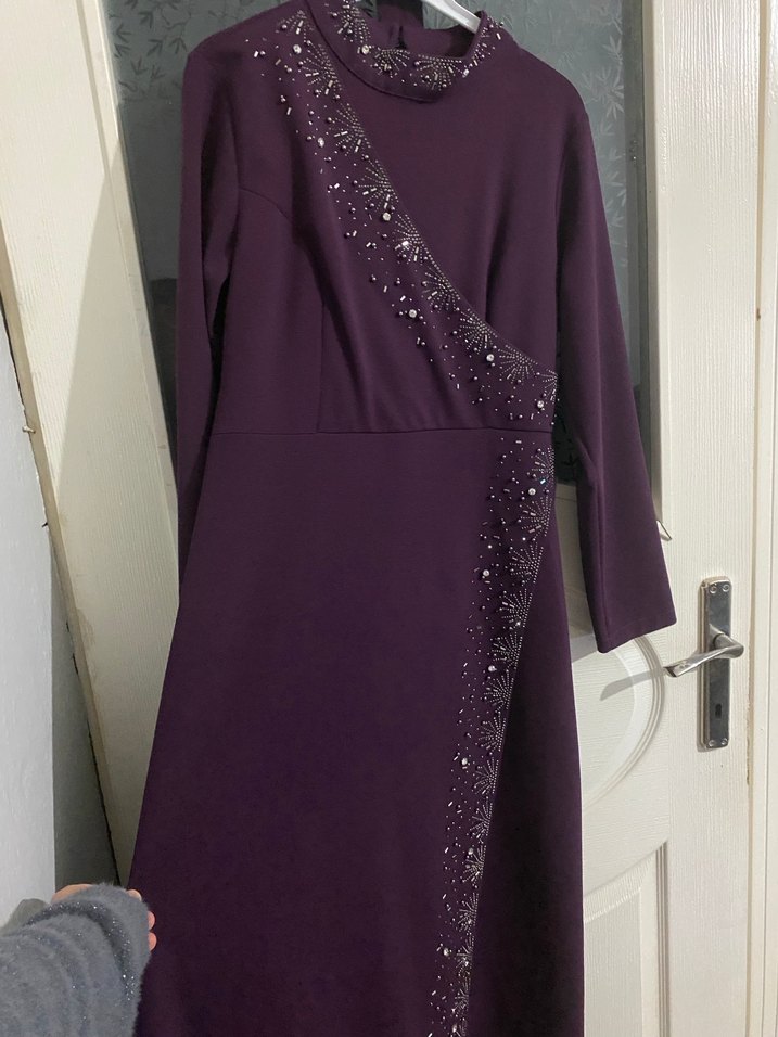 Koyu mor renkli, uzun kollu ve yüksek yakalı, işlemeli drapeli uzun abiye elbise. Düğün ve özel davetlere uygun klasik şıklık sunar.