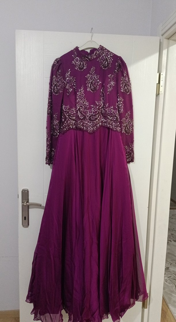 Mor uzun kollu abiye elbise, yüksek yakalı ve işlemeli detaylara sahip. Salaş kesimi ve drapeli eteğiyle klasik vintage tarzda, düğünler için uygun. ister nişanlık ister söz elbisesi olarak kullanabilirsiniz. tarlatanli ve tarlatansiz kullanilabilir. tarlatani hediye olarak verilecektir.