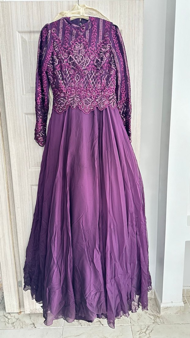 Mor Uzun Kollu İşlemeli Kadın Abiye