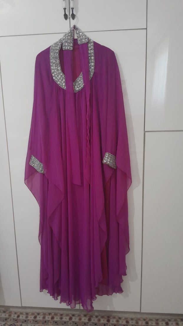 Mor uzun kollu, bol kesim ve drapeli kadın abiyesi. V yaka ve yakada, kollarda parlak işlemeli detaylar bulunur. Düğünler için uygundur.