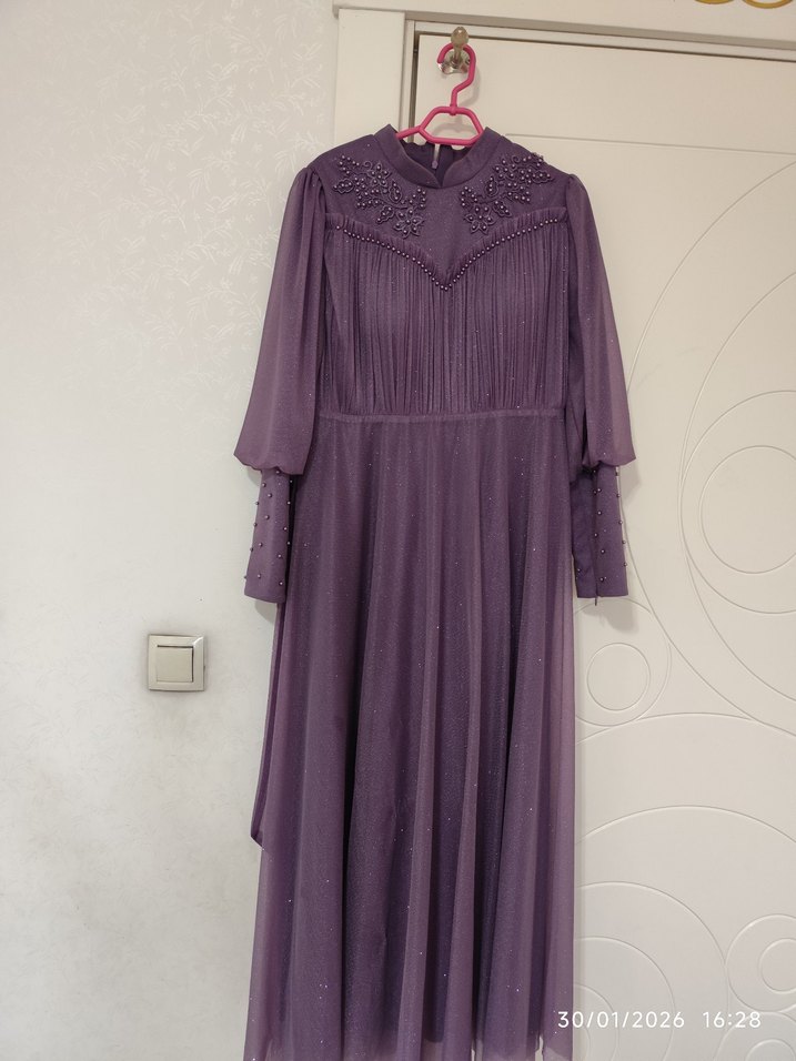 Mor uzun kollu, yüksek yakalı işlemeli abiye elbise. Bol kesim ve drapeli detaylarla vintage klasik şıklık sunar.