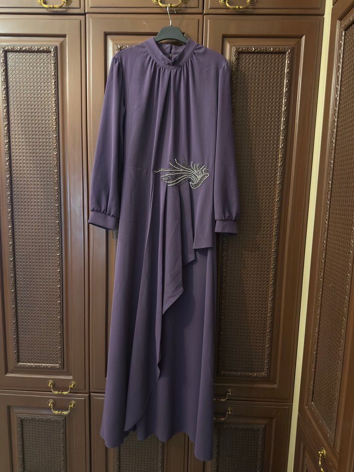 Sıfır etiketli. Mor renkli uzun kollu abiye elbise, drape detaylı ve işlemeli. Yüksek yakalı, düzenli kesim ve mütevazı tarz için uygun. 42 beden arkası fermuarlı.